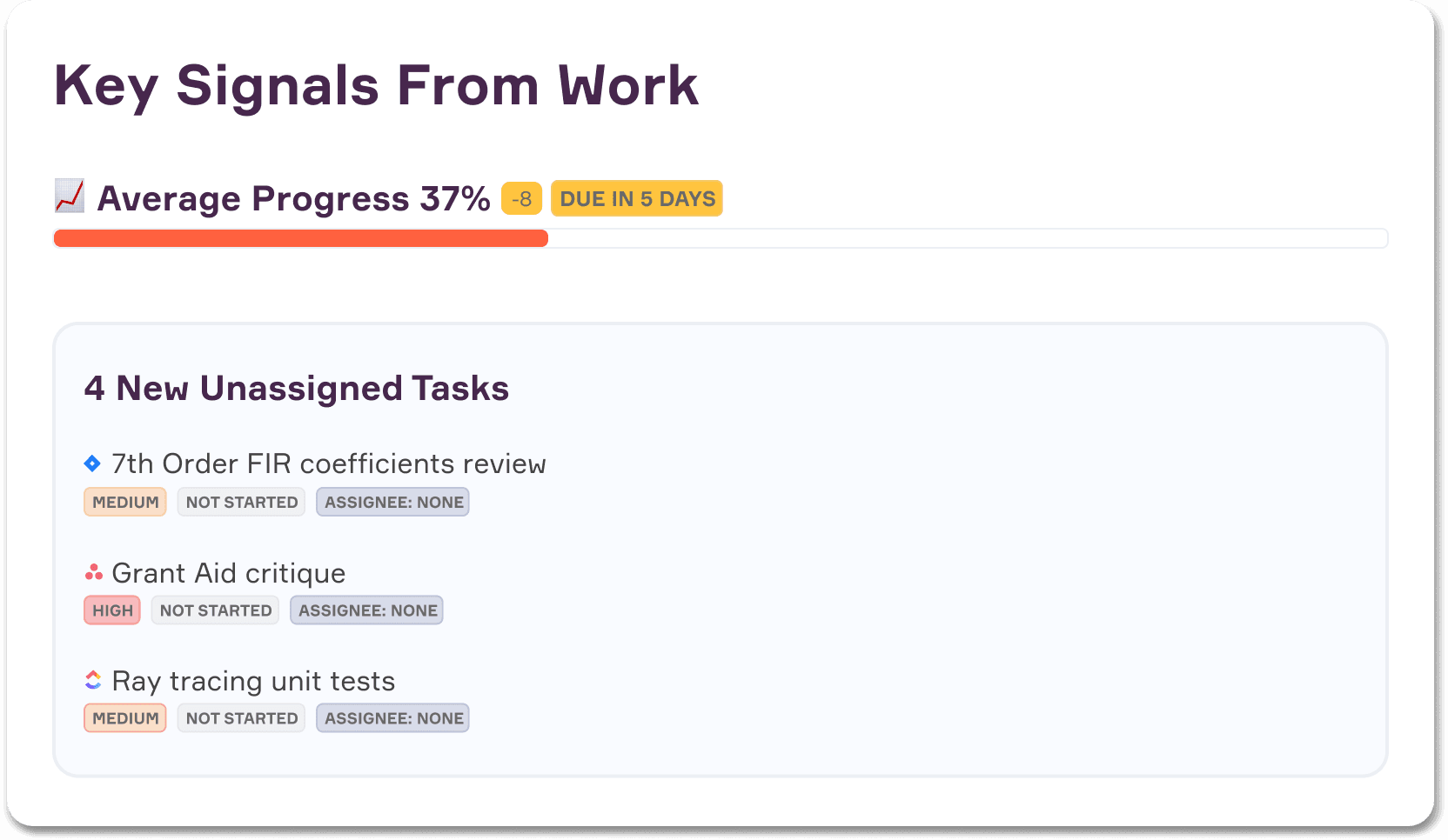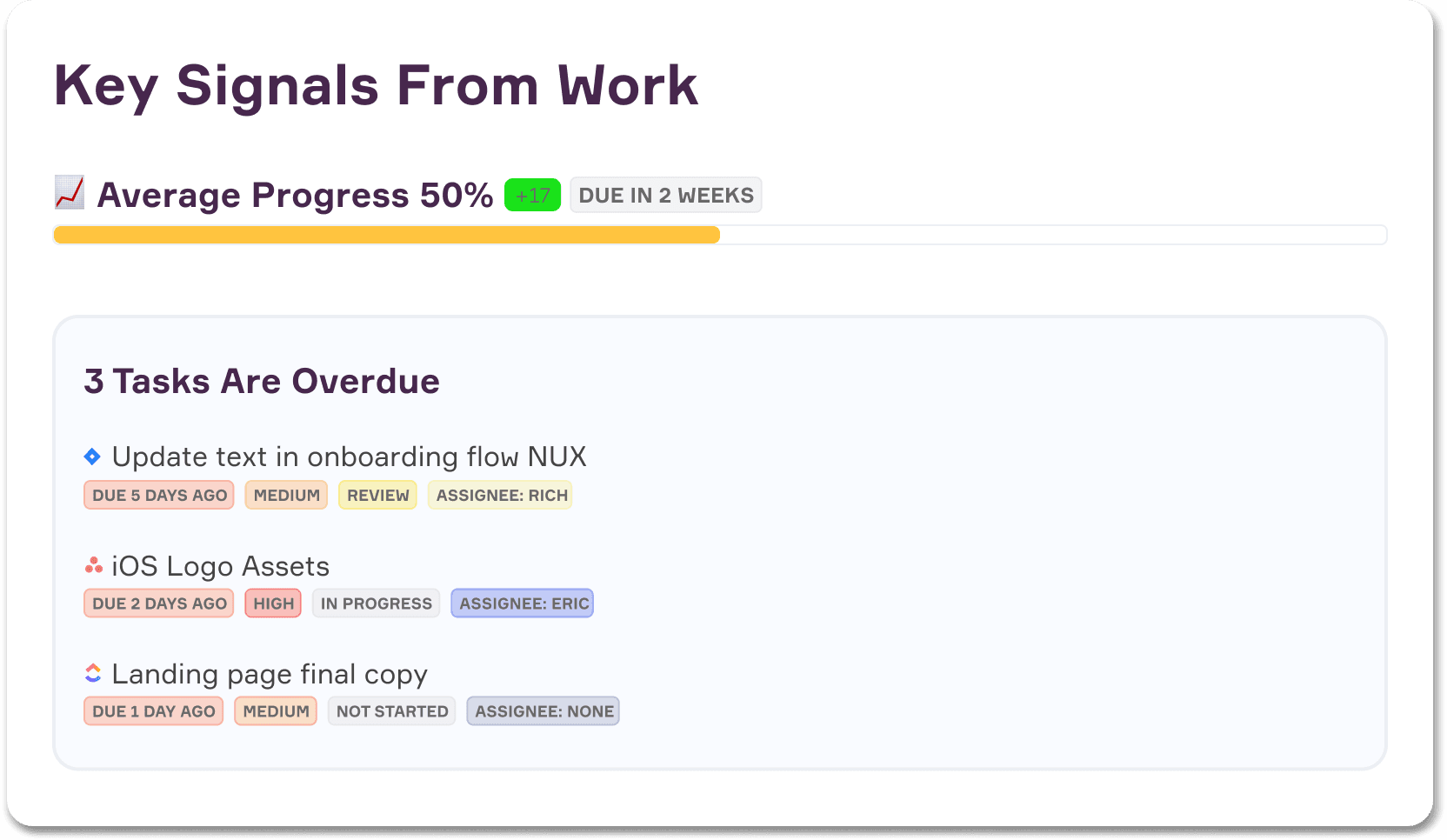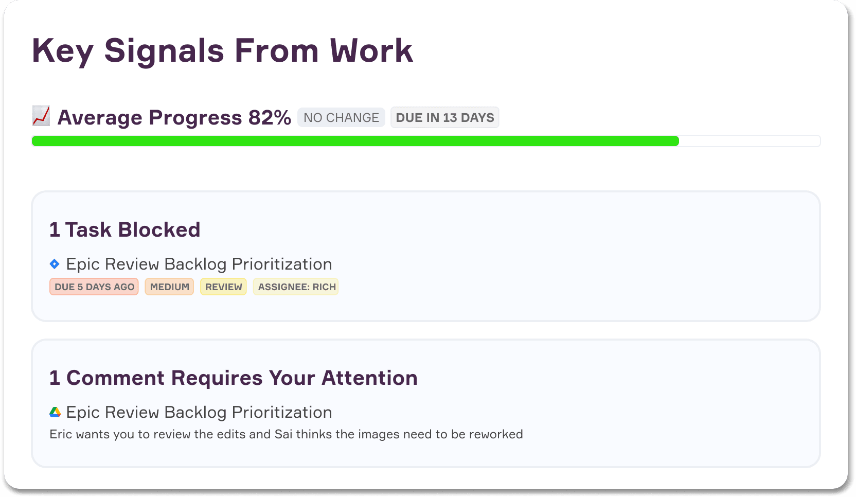 See overdue tasks, tagged comments and work blockers in one place.