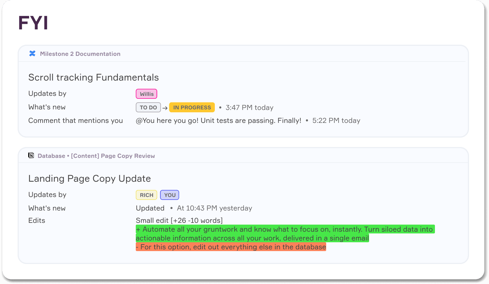 Track project progress, celebrate wins, catch missed KPIs across tools with zero effort.
